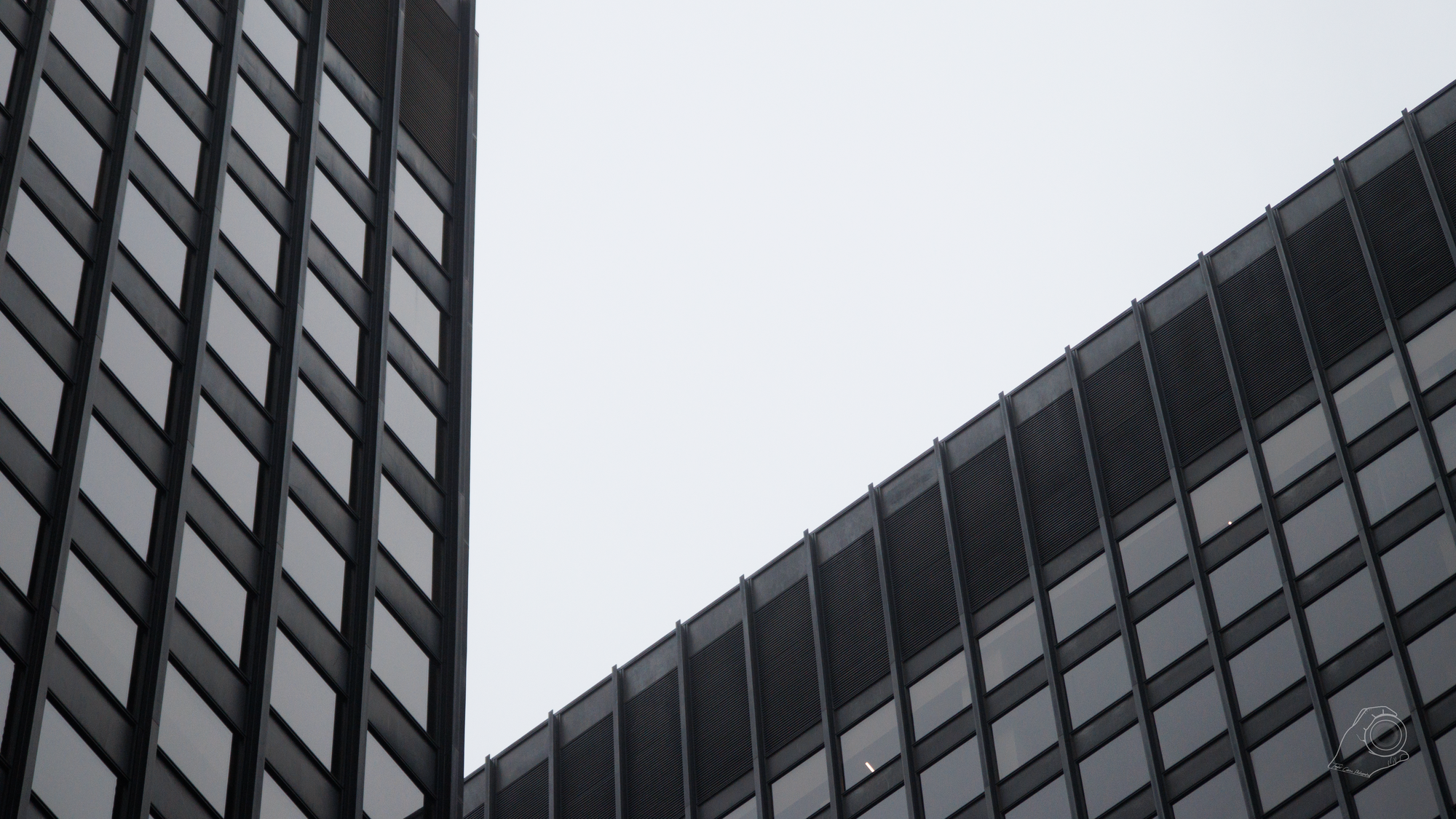 As I turned back towards Michigan Avenue, I spotted the backside of Michigan Plaza and the buildings surrounding it. On a whim I ascended the stairs and caught a few shots of the angles of the buildings, capturing a start contrast of the dark black glass against the almost-white greyness of the clouds above. I thought they were decent shots, but it wasn't till I got home that I realized amongst that crop would be my favorite shot of the afternoon:
